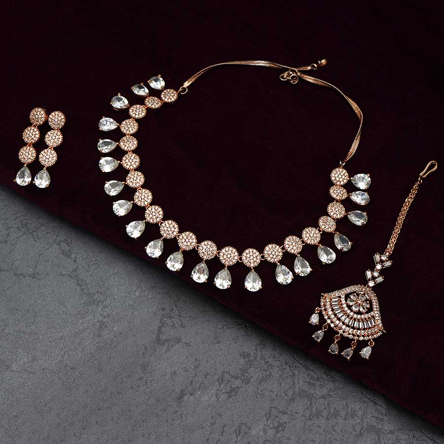 Hey Beautiful! Head Turner Diamond Jewelry Set the Classy Statement Piece Which Can Never Wake you Go Wrong with This Classic Piece of Jewelry. It Makes You Shine On! It’s a Jewelry Set That Sets Fit For the Queens! The Royal Vibe with The Stone Studded Jewelry Set . It Consist Of Necklace and Matching Earrings Crafted with Rhodium, Silver Gold, Brass Plated tones , CZ Diamonds , Pearls and Beads Bring your Stye a Whole New level!