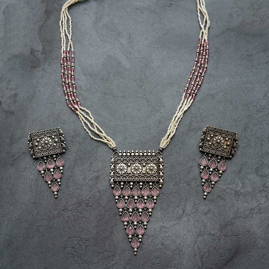 Afghani Tribal Antique Boho Pink Stone Pearl Necklace with Earrings