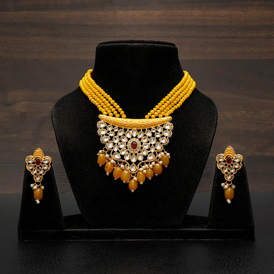 It’s a Jewellery set that suits and fits the Princess and Queens! They excude the royal vibes with the royal, antique, vintage hight matte gold finish touch with stones, kundan work, temple cuts jewellery sets. It consist of necklace set with matching earrings or matha pattis which is crafted from high gold polished 1 gm and matte finish and with brass as the metal ino it. Celebrate the uniqueness in yourself by making yourself look more pretty in our pieces.