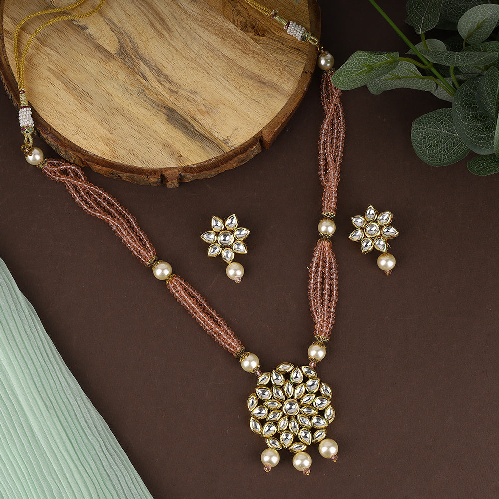 It’s a Jewlery set that suit and fits the Princess and Queens! They exude the royal vibes with the royal, antique, vintage Hight matte gold finish touch with stones, Kundan work, temple cuts jewelry sets. It consists of necklace set with matching earrings or Matha Pattis which is crafted from high gold polished 1 gm and matte finish and with brass as the metal into it. Celebrate the uniqueness in yourself by making yourself look more pretty in our pieces.