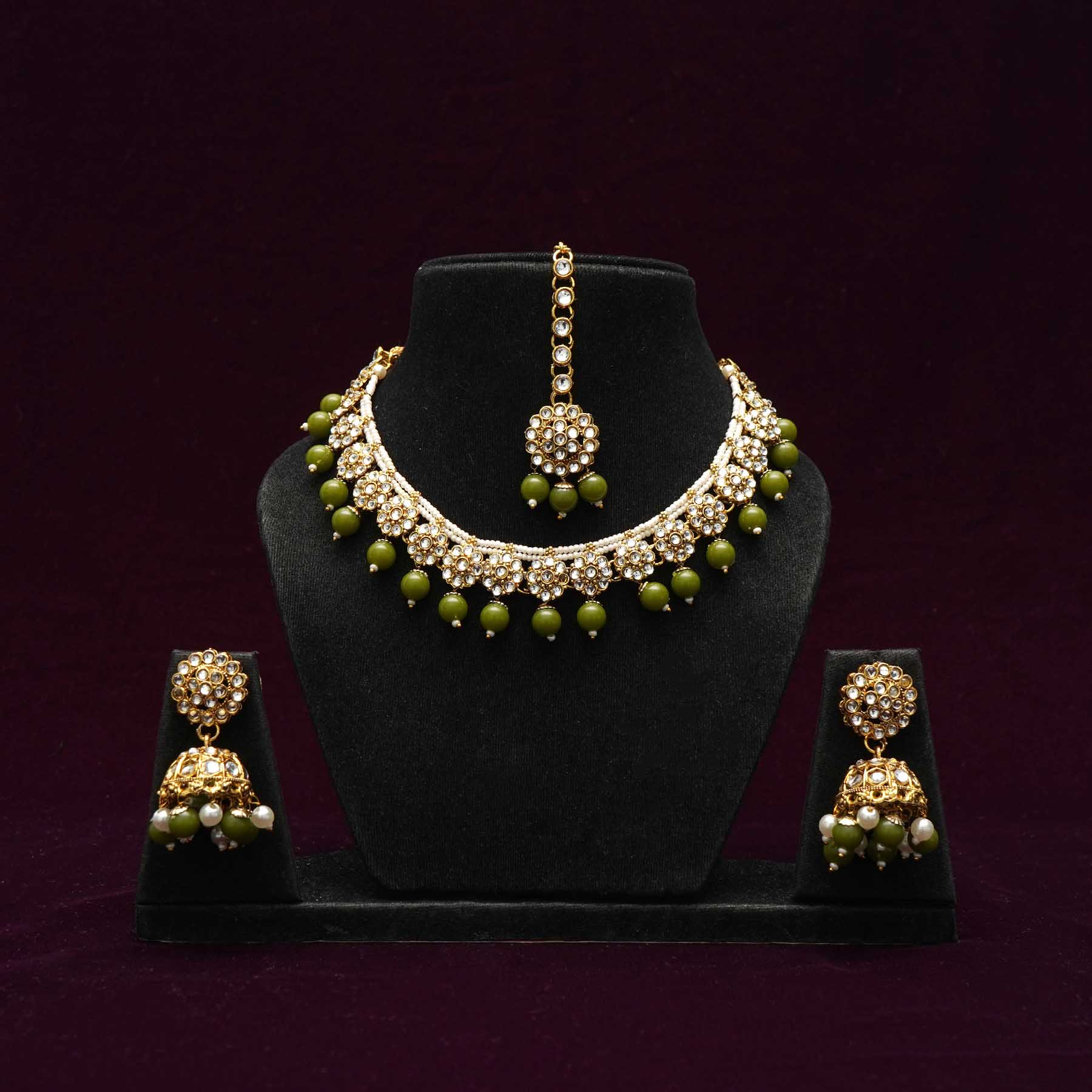 Gold Plated Kundan Choker Set with Green &White Pearls