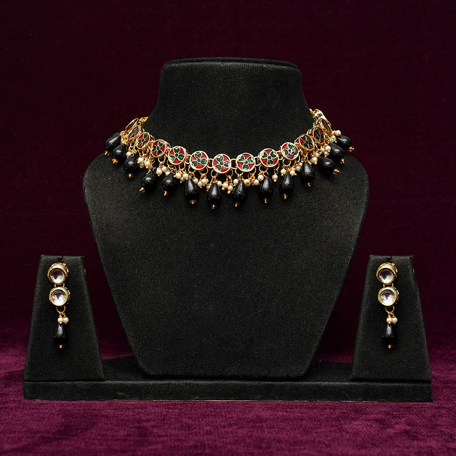 Meraki High Quality Kundan Polki Choker Set With Black Beads