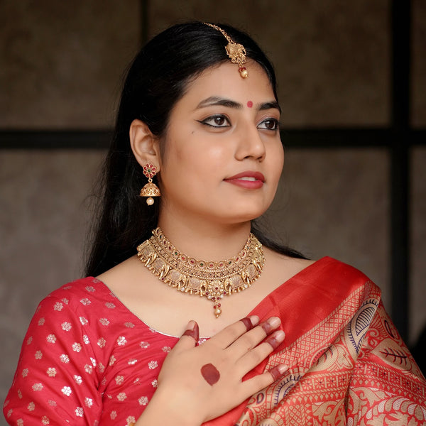 It’s a Jewelry set that suits and fits the Princess and Queens! They exclude the royal vibes with the royal, antique, vintage height matte gold finish touch with stones, kundan work, temple cuts jewelry sets. It consist of necklace set with matching earrings or mattha pattis which is crafted from high gold polished 1 gm and matte finish and with brass as the metal into it. Celebrate the uniqueness in yourself by making yourself look more pretty in our pieces.