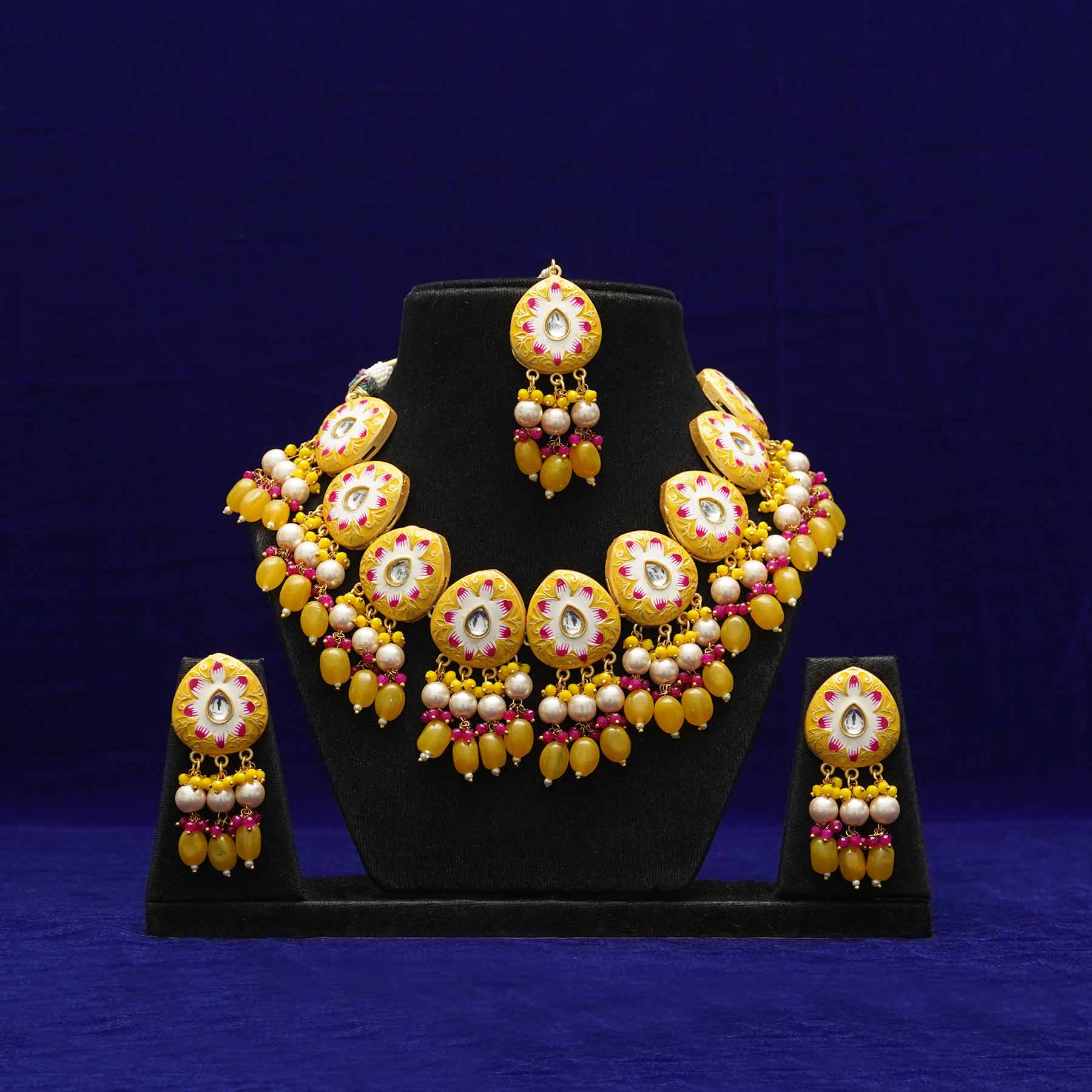 It’s a Jewlery set that suit and fits the Princess and Queens! They exude the royal vibes with the royal, antique, vintage Hight matte gold finish touch with stones, Kundan work, temple cuts jewelry sets. It consists of necklace set with matching earrings or Matha patties which is crafted from high gold polished 1 gm and matte finish and with brass as the metal into it. Celebrate the uniqueness in yourself by making yourself look more pretty in our pieces.