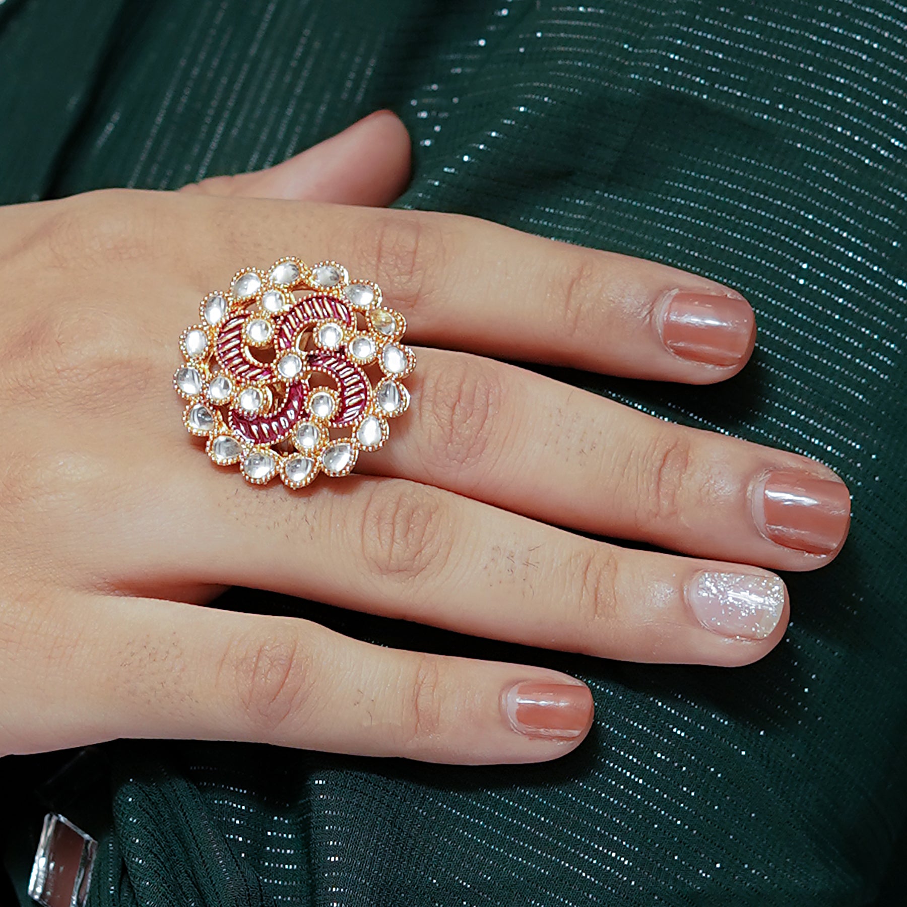 The royal hand jewellery is always so adorable that attract women’s attention. This kundan and polki has been magnified with more insane art that gives you a fascinating look.