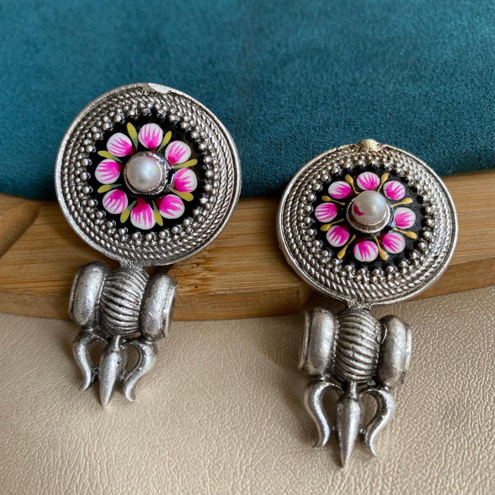 Oxidized Trisula Style Earring with Handprinted Floral Design